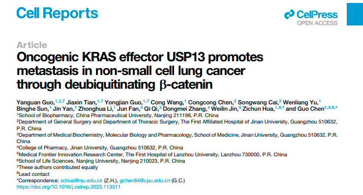 骰宝规则陈果教授课题组在Cell Reports期刊上发表了题为Oncogenic KRAS effector USP13 promotes metastasis in non-small cell lung cancer through deubiquitinating β-Catenin的文章。该研究发现KRAS激活上调去泛素化酶USP13,是KRAS突变肿瘤的一个新的下游效应蛋白。USP13促进肺癌细胞转移,其高表达与肺癌患者不良预后高度相关。