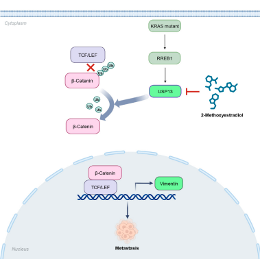 该研究鉴定USP13是治疗转移性KRAS突变肿瘤的潜在药物靶点。并且,筛选发现了一个天然小分子药物2-Methoxyestradiol能够直接抑制USP13活性,为通过靶向USP13治疗KRAS突变肿瘤的转移提供了一个先导化合物,具有临床转化潜力。将为KRAS突变肿瘤的精准治疗提供了一个新的科学依据。骰宝规则 博士生田家欣为该论文的共同第一作者。