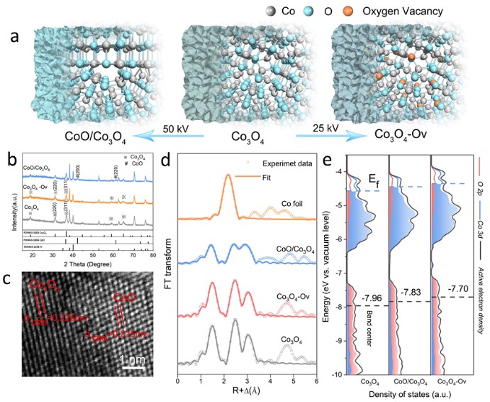 研究人员通过Ar离子束对Co3O4进行辐照,在样品中分别产生大量氧空位以及诱导相变产生CoO/Co3O4界面。电化学性能测试结果表明Ar离子辐照可以有效提升Co3O4析氧性能。结合理论计算,研究人员进一步揭示了由于氧空位和CoO/Co3O4界面对于表面活性电荷的梯度调控,增强了Co3O4表面对于反应过程中单氧基团的吸附能力,从而极大降低反应势垒和过电势。该工作在实现Co基电催化剂析氧性能新突破和反应机理更加深入认知的基础上,进一步拓展离子束方法使用范围,展示了将其发展为一种对材料电子结构进行缺陷以及界面调控的普适研究手段的重要价值。