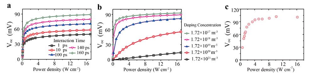 图2:载流子-晶格相互作用时间以及掺杂浓度对光热电效应的影响、器件优化后测得的光电响应