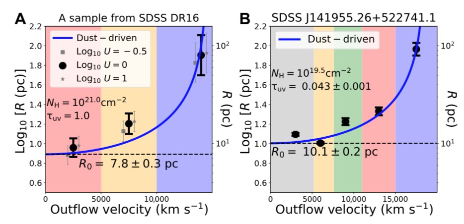 图2 首次发现高速外流在百光年尺度上的加速现象。这个尺度远远超出黑洞吸积盘尺度,并且速度分布与尘埃环起源的尘埃加速模型高度吻合。