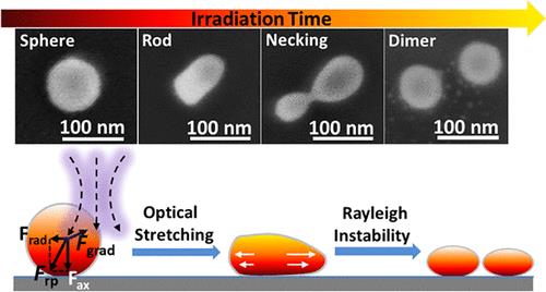 光子材料与技术课题组(PMT)的研究人员在利用激光辐照金纳米颗粒导致其熔融的同时,利用光学力的协同作用,使近球形的金纳米颗粒发生拉伸变成纳米棒最终断裂得到二联体(图1)。其成功的关键在于基底对纳米颗粒的粘滞作用,以及合适的温度(辐照功率)让金纳米颗粒发生软化,光学力才能够克服粘滞阻力对金颗粒产生拉伸作用。通过对温度以及光学力的模拟,他们发现梯度力以及光压力的水平分量对于金颗粒的拉伸起到主要作用。这一发现为纳米颗粒形貌的光学调控提供了一种新手段。