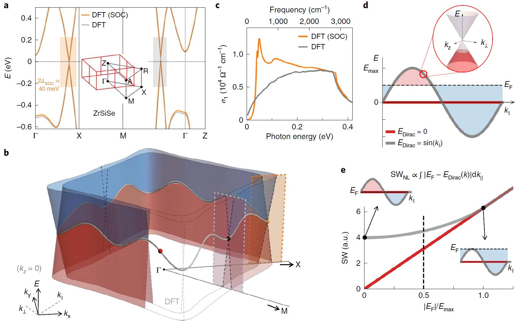 图3:第一性原理计算得到的拓扑节线半金属ZrSiSe电子结构和光学性质。