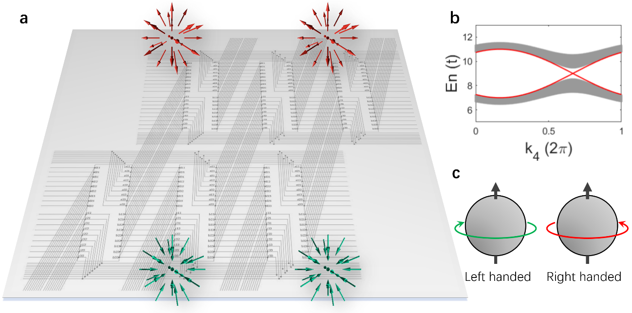(a)四维电路投影到二维电路板上。其三维边界上可以存在一对手性相同的外尔点。(b)三维边界上体态(灰色部分)和外尔点的色散(红色部分)。 (c) 外尔点手性示意图。