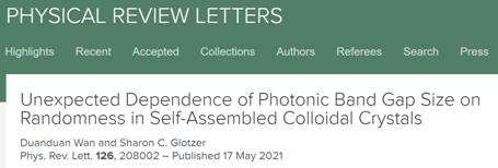 万端端副研究员的最新研究成果。论文题为“Unexpected Dependence of Photonic Band Gap Size on Randomness in Self-Assembled Colloidal Crystals” ( 《自组装胶体晶体中光学能带对随机性的未预期依赖》 )。