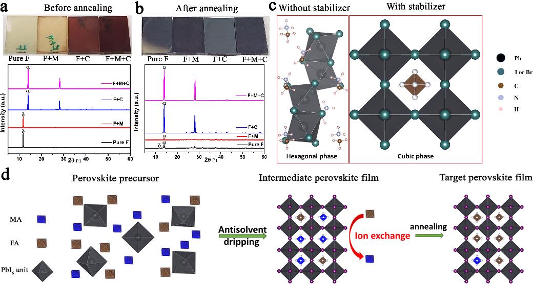 方国家教授课题组和香港理工大学李刚教授课题组合作,开发了一种稳定剂辅助生长高质量钙钛矿薄膜的方法,并显著提高了相应钙钛矿电池的光电性能和稳定性。甲脒铅碘(FAPbI3)基钙钛矿具有理想的光学带隙,根据Shockley-Queisser效率极限,FAPbI3钙钛矿太阳能电池具有更高的理论光电转换效率。但FAPbI3材料的相稳定性和长期稳定性都比较差,因此很难制备高效、稳定的FAPbI3基钙钛矿电池。