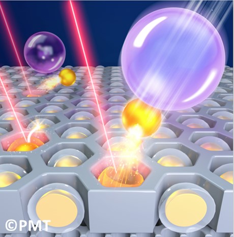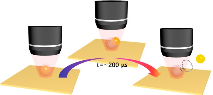 最近,丁涛课题组开发了一类基于等离激元物理化学作用的纳米弹射体系。他们首先制备了金@C60的核壳结构的纳米颗粒,利用激发的等离激元光热效应以及近场增强光化学作用,使得C60在空气中迅速氧化成气态的CO2,由于局部的瞬时高温,气态的CO2迅速产生了较高的内部压力,从而将金颗粒喷射出去,整个过程在大约200 μs内完成(图2)。计算表明该喷射作用力可达μN量级,比之前报道的纳米驱动装置输出力大了三个数量级。金颗粒喷射出去的瞬时初速度可达300 m/s,与子弹的速度相当,因此,可以形象地认为该体系是一种纳米尺度上可光触发的等离激元“炸药”。