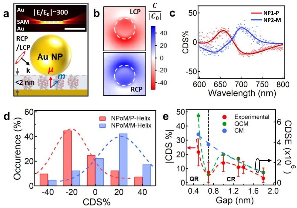 2. 基于极端纳米光场实现手性超分子的超灵敏探测。(a) 超分子等离激元体系(NPoM)的示意图;(b)局域超手性近场的模拟计算;(c)对映体超分子层的手性光学传感;(d)大量颗粒对对映体超分子传感的统计结果;(e)等离激元纳腔在经典和量子区间内对手性超分子的增强行为。
