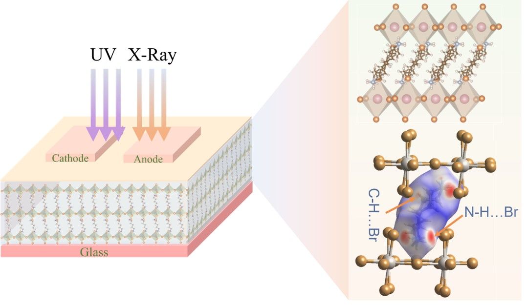 与传统的三维钙钛矿相比,二维(2D)钙钛矿具有许多独特优势,包括优异稳定性、抑制离子迁移和各向异性电荷输运等等。根据晶体学定义,二维钙钛矿可分为Ruddlesden-Popper (RP)型和Dion-Jacobson (DJ)型。2D DJ钙钛矿在探测方面通常优于RP钙钛矿,但对DJ型钙钛矿的研究明显滞后与RP型钙钛矿,并且有机阳离子对2D DJ钙钛矿结构和光电性能的影响很少受到关注。该工作中,研究人员详细研究了2D钙钛矿中有机间隔层对光电性能的影响,理论分析发现2D DJ DPAPbBr4 (DPB, DPA = NH3C5H10NH3)钙钛矿晶体存在由层间分子构象诱导的多重氢键的有趣而独特的现象。此外,DPB晶体还存在两种氢键类型:N-H∙∙∙Br和C-H∙∙∙Br。DPB中氢键数量的增加增强了晶格刚度,有利于载流子输运,从而改善了光电性能。随后,我们合成了微米和厘米尺寸DPB钙钛矿单晶用于研究其在紫外和X射线辐照下的光电特性。紫外探测方面,C/DPB/C结构探测器具有~ 10-14 A的低暗电流,4.89 × 104的高开关比和高达154 dB的超宽线性动态范围。此外,即使在极弱的光照条件下,这些器件也表现出出色的响应,并且得到了高分辨的弱光成像图像。在X射线方面,Au/DPB/Au表现出灵敏的响应,检测极限为1.44 μGyair/s,灵敏度可达663 μC Gyair-1 cm-2。该工作为探索2D DJ钙钛矿在未来制造高效光电应用提供了思路。