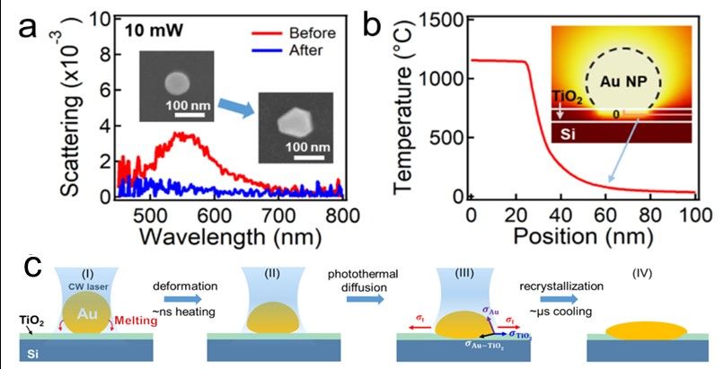 图1. 薄膜辅助金纳米颗粒的光热变形。 (a)激光照射前后Au纳米颗粒的散射光谱变化及SEM图像变化; (b) TiO2薄膜在不同位置的温度分布,插图为15 nm TiO2/Si衬底上Au纳米颗粒周围的模拟温度分布,粉色的线标志着X轴的起点和终点;(c) 薄膜辅助金纳米颗粒光热变形机理:(Ⅰ) Au纳米颗粒的熔融;(Ⅱ) 变形成面包状Au纳米液滴;(Ⅲ) 薄膜辅助Au纳米液滴侧向拖曳成圆盘液滴; (Ⅳ) Au圆盘液滴冷却再结晶成Au纳米片。
