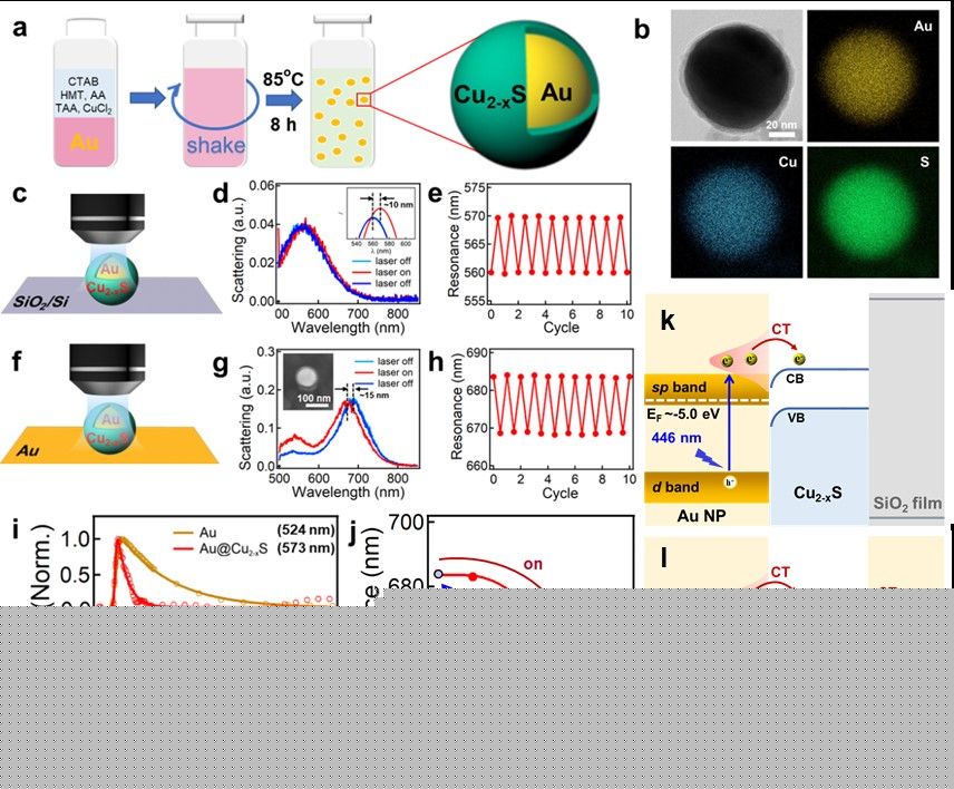 研究团队首先制备了Au@Cu2-xS核壳纳米颗粒(图1a),并对其微观结构进行了表征。实验结果表明,溶胶凝胶法可简单高效地制备不同壳层厚度的Au@Cu2-xS核壳纳米颗粒(图1b),为实现纳米等离激元超快动态调控提供理想载体。不同衬底上的Au@Cu2-xS纳米颗粒可以实现等离激元超快动态调控,在激光照射下,在SiO2/Si衬底上的Au@Cu2-xS纳米颗粒的等离激元共振峰发生红移(图1c-e),相反,在Au衬底上的Au@Cu2-xS纳米颗粒的等离激元共振峰发生蓝移(图1f-h)。当激光关闭,共振峰都回到初始位置。所有光电调谐过程都具有可逆性、可控性和较快的响应速度。瞬态吸收(TA)光谱(图1i)和模拟计算(图1j)表明,Au@Cu2-xS等离激元复合结构通过光激发可使Au的热电子向Cu2-xS转移,导致Au的电子密度降低,从而使局域表面等离激元共振(LSPR)发生红移(图1k)。相反,当Au@Cu2-xS放置在Au衬底上(NPoM结构)时,热电子可以通过Cu2-xS层传输到Au衬底,提高了纳米间隙的电导率,从而导致耦合等离子体激元的蓝移(图1l)。这种基于热载流子输运的等离激元调控策略特别适合光电器件的集成,为光子计算与互联提供器件原型。