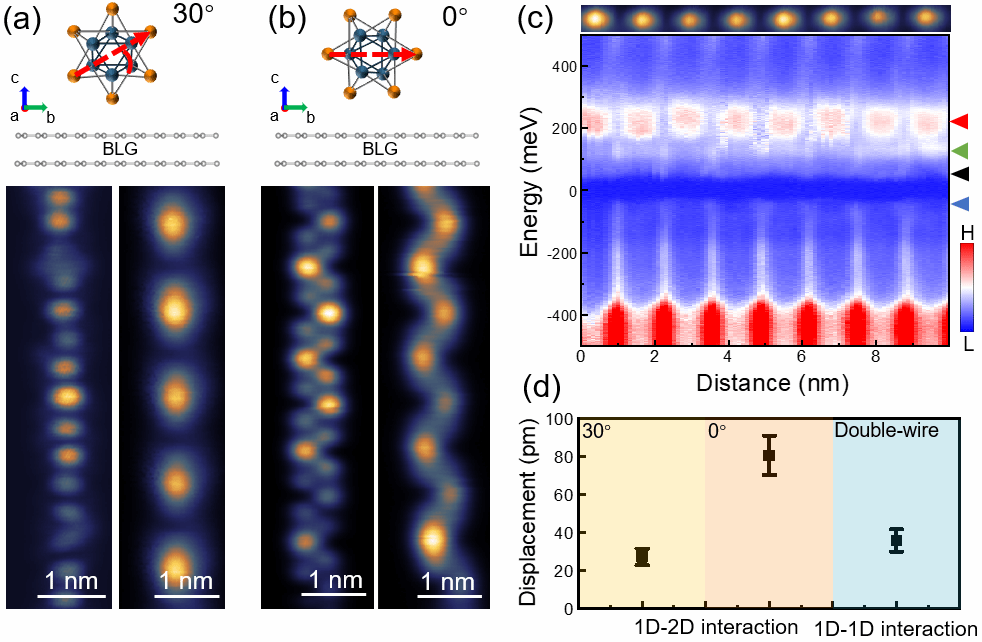 图1. (a, b)单根Nb6Te6纳米线轴向角度不同导致不同的原子分辨与超周期。(c)单根纳米线中的周期性电荷调制. (d)1D-2D与1D-1D范德华相互作用对单根纳米线晶格畸变的影响。
