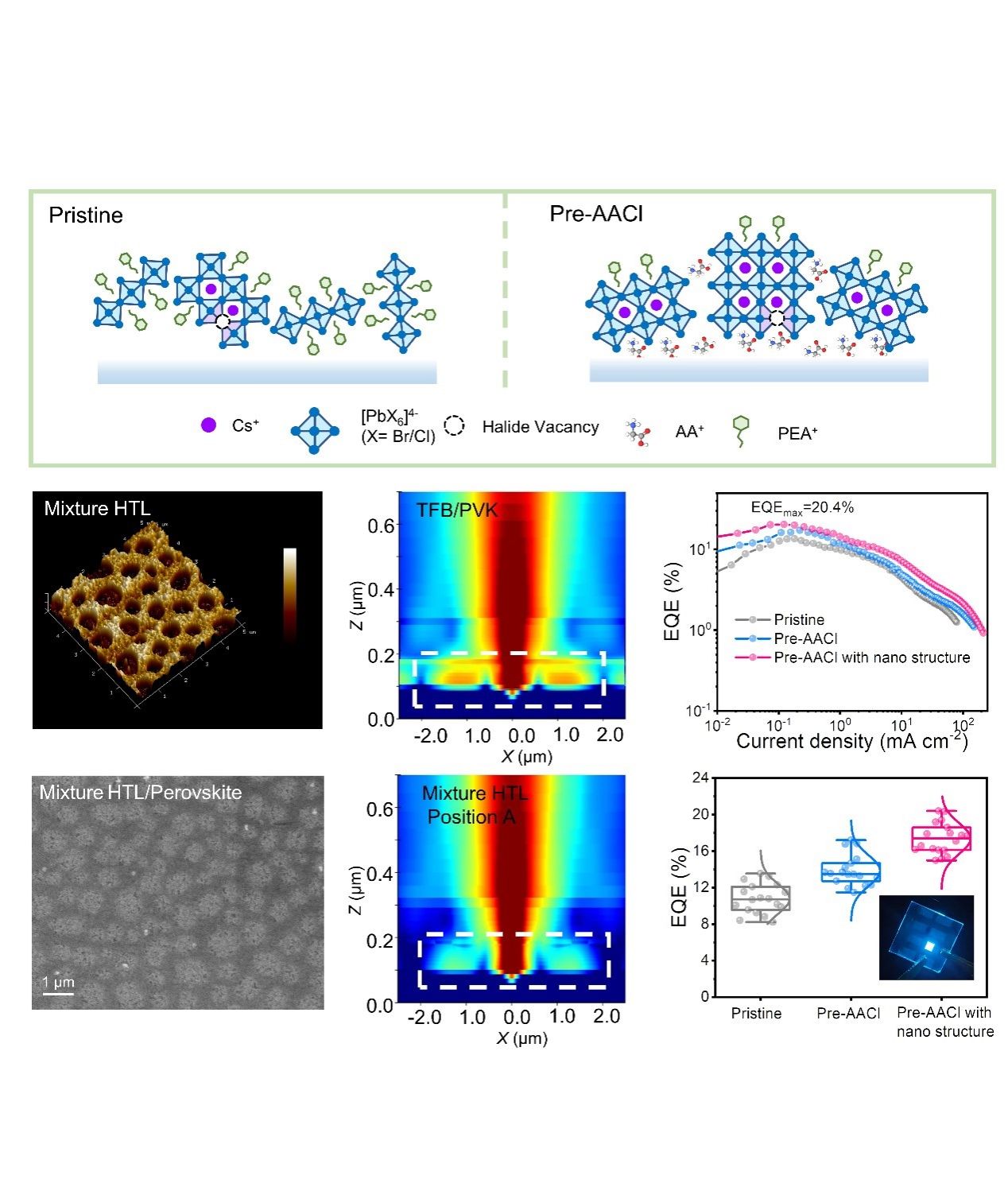 方国家教授、柯维俊教授、林雪平大学高峰教授近日在《Science Bulletin》期刊上发表了题为:“Buried interface modification and light outcoupling strategy for efficient blue perovskite light-emitting diodes ”的文章。在这项工作中,作者提出了一种埋底界面修饰策略,通过关注器件的底部空穴传输层(HTL)来解决这些问题。一方面,引入了一种多功能分子,甘氨酸盐酸盐(AACl),用于修饰HTL/钙钛矿界面,以调节钙钛矿的结晶。实验研究和理论计算表明,AACl可以通过抑制低n值低维钙钛矿相的生长并有效减少体块钙钛矿中的非辐射复合损失。另一方面,在空穴传输层中巧妙地应用了一种自组装纳米网结构来提高出光效率。通过将聚合物TFB和PVK的溶液混合制备了这种纳米网结构,显著提高了PeLEDs的光耦合取光效率。最终,制备了发光峰位峰位于487 nm的天蓝光PeLEDs,外量子效率达到了20.4%;同时也制备了峰位于470 nm处的纯蓝光发光二极管,其外量子效率为12.5%;这些都是同类器件报道的世界最高效率之一。这项工作为实现高性能蓝色PeLEDs提供了新思路。