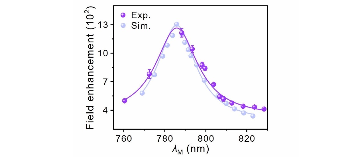 2实验和模拟的面外近场增强与等离激元共振波长的函数关系。