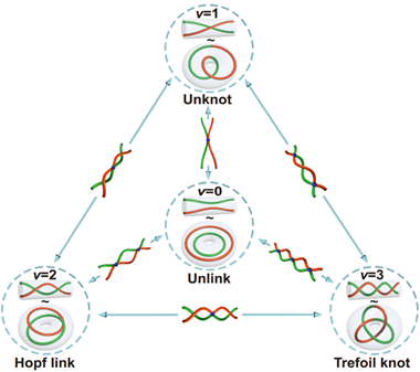 图1. 两股绳子(或能带)的编织与拓扑相变。圆柱内两股编织的绳子首尾连接后可形成轮胎内的扭结和链环结构,它们可通过具有结点的中间态相互转变。