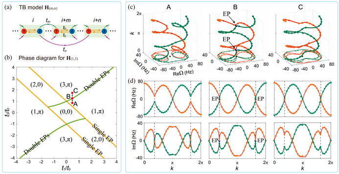 图2. 复能带编织及其拓扑相变。(a) 晶格模型;(b) 模型相图,其中A→B→C代表v=1到v=3能带编织的拓扑相变;(c) 相变过程的复能带结构;(d) 相变过程的能带实部和虚部变化。灰色球代表相变态中的奇异点。