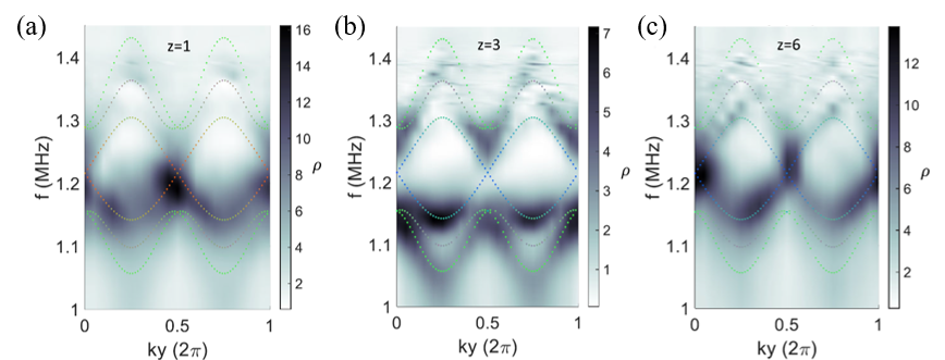 图2.实验测量的Hopf绝缘体电路的频带结构。(a-c) 分别为在z=1 (下边界)、z=3 (体内) 和z=6 (上边界) 层的频谱。