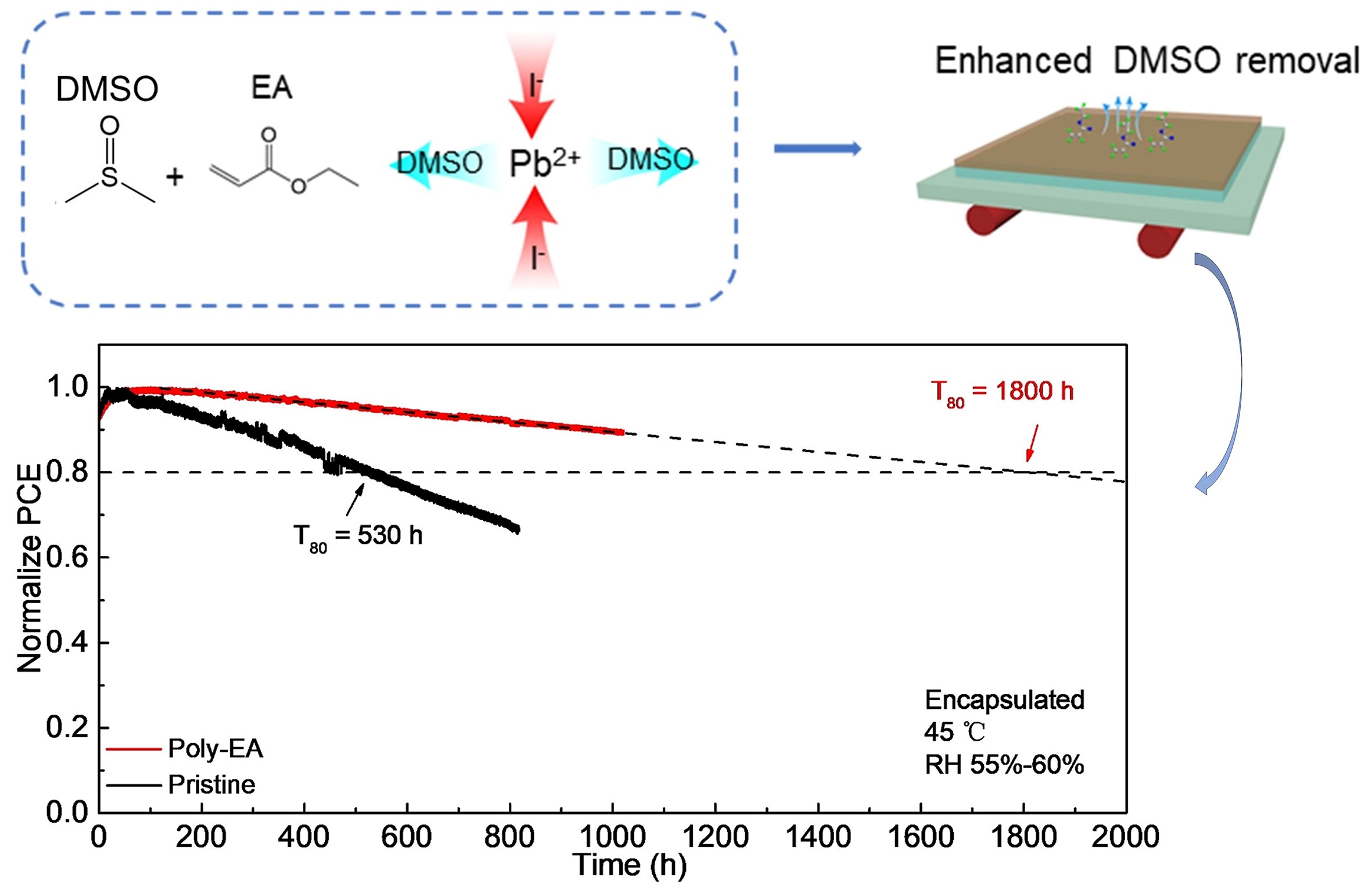 在这项研究中,研究者们发现通过向钙钛矿前驱体溶液中引入了小分不饱和单体添加剂丙烯酸乙酯(EA)。它既具有小分子易溶解与移动的特性,在完成原位聚合后也具有聚合物的稳定性。在钙钛矿前驱体溶液中,单体小分子状态的EA与Pb2+之间具有相互作用,也与DMSO之间具有相互作用,促进了DMSO与Pb2+之间的解离。同时EA具有低沸点,这些都有利于DMSO在钙钛矿结晶的过程中去除,改善了钙钛矿的结晶,降低了薄膜中的缺陷与孔洞。钙钛矿结晶完成之后,原位聚合生成了聚丙烯酸乙酯(poly-EA),poly-EA是具有疏水性的聚合物,在钙钛矿薄膜的表面有利于阻挡水分子的侵袭,同时侧链上的氧原子与Pb2+之间的相互作用可以进一步钝化薄膜中的缺陷。这种兼具小分子与聚合物特性的添加剂使得小面积器件的光电转换效率(PCE)达到了25.4%,15 cm2钙钛矿太阳能电池mini-模组的PCE达到了20.3%。同时,器件在55-60%RH以及AM1.5G光照下的长期稳定性测试中,T80达到了1800h。