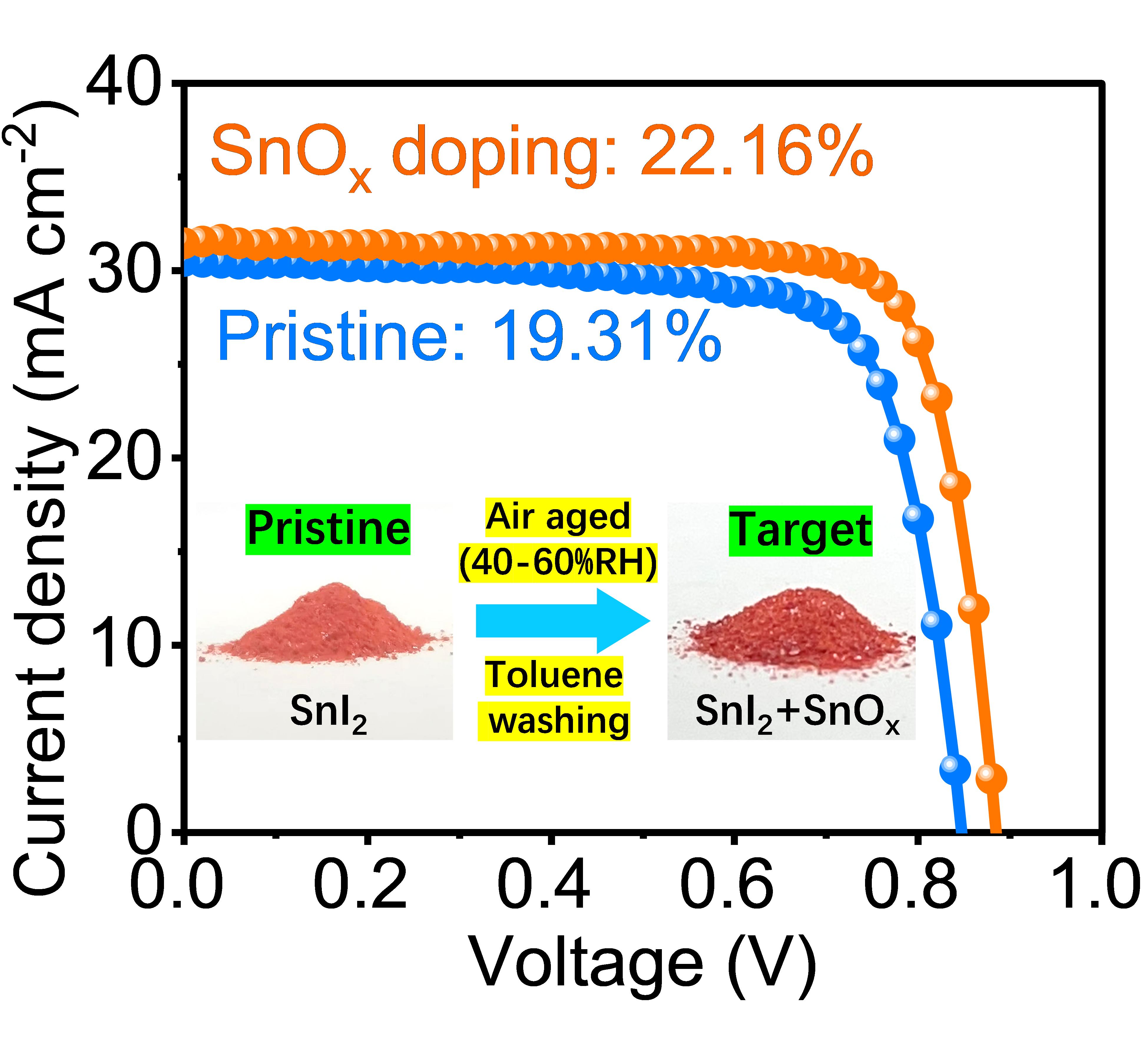 全钙钛矿的窄带隙子电池通常使用锡/铅基(Sn-Pb) 混合的钙钛矿吸光层。Sn-Pb混合钙钛矿需要引入Sn元素才能获得窄带隙,但是其中亚稳态的Sn2+很容易被氧化成Sn4+。这会导致p型自掺杂行为,并且载流子复合严重,从而降低太阳能电池的性能和稳定性,所以是领域内当前的共性挑战问题。基于此,该工作提出了一种简便的自然氧化得到的SnOx掺杂Sn-Pb窄带隙钙钛矿。SnOx掺杂可以使Sn-Pb钙钛矿薄膜的形貌、晶体质量大大改善,并且有效地减少了缺陷。更有趣的是, SnOx 掺杂还能够提高Sn-Pb钙钛矿的费米能级,有利于载流子的输运/提取,从而大大减少载流子的复合。所制备的SnOx掺杂的窄带隙钙钛矿太阳能电池的效率高达22.16%,未封装的SnOx掺杂的窄带隙钙钛矿太阳能电池也具有增强的稳定性,在充满氮气的手套箱中储存2300小时后,其可以保持约100%的初始效率。得益于高效的单结窄带隙钙钛矿太阳能电池,制备的两端全钙钛矿叠层太阳能电池的效率达到26.01%。该工作介绍了一种简单的掺杂策略,用于制造高效率的单结窄带隙钙钛矿及其叠层太阳能电池,为进一步制备效率超过30% 的叠层电池提供了新思路。论文题为“Efficient Narrow-bandgap Mixed Tin-lead Perovskite Solar Cells via Natural Tin Oxide Doping”(《利用自然氧化的氧化锡掺杂制备高效窄带隙锡铅混合钙钛矿太阳能电池》),该工作发表在Advanced Materials上,第一作者为骰宝规则 科研助理黄立帅。