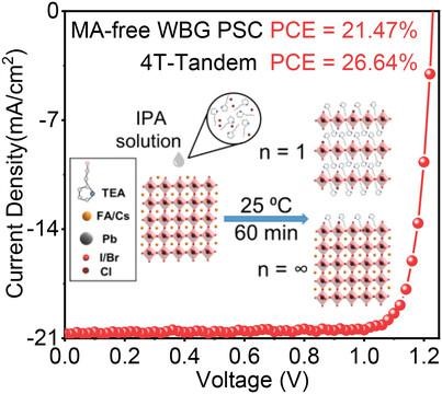 全钙钛矿叠层电池中的宽带隙钙钛矿子电池的性能也非常关键,然而宽带隙钙钛矿电池的大开路电压(VOC)损失和严重的光诱导卤素相分离仍然是阻碍其应用的重要挑战。基于此,该工作提出了一种不经过热退火的后处理策略,在宽带隙钙钛矿上表面形成2-噻吩乙基卤化铵的单相二维钙钛矿(n = 1)表面修饰层。与产生多个二维相的传统热退火方法相比,这种无热退火后处理的方法可以更有效地钝化宽带隙钙钛矿薄膜的缺陷,抑制光诱导的钙钛矿相分离。由此制备的不透明和半透明的1.66 eV 无甲胺基的宽带隙钙钛矿太阳能电池的最大光电转化效率分别为21.47% (0.43 V 的小开路电压损失)19.11%,这两者都是报道的同类电池的最高效率之一。由此制备的四端全钙钛矿叠层电池达到了26.64% 的效率,在高效多结叠层太阳能电池中显示了广阔的应用前景。论文题为“Low-Dimensional 2-thiopheneethylammonium Lead Halide Capping Layer Enables Efficient Single-Junction Methylamine-Free Wide-Bandgap and Tandem Perovskite Solar Cells”(《低维2-噻吩乙基铵卤化铅覆盖层实现高效单结无甲胺宽禁带和叠层钙钛矿太阳能电池》),该工作发表在Advanced Functional Materials 上,第一作者为骰宝规则 2021级博士生管红令。