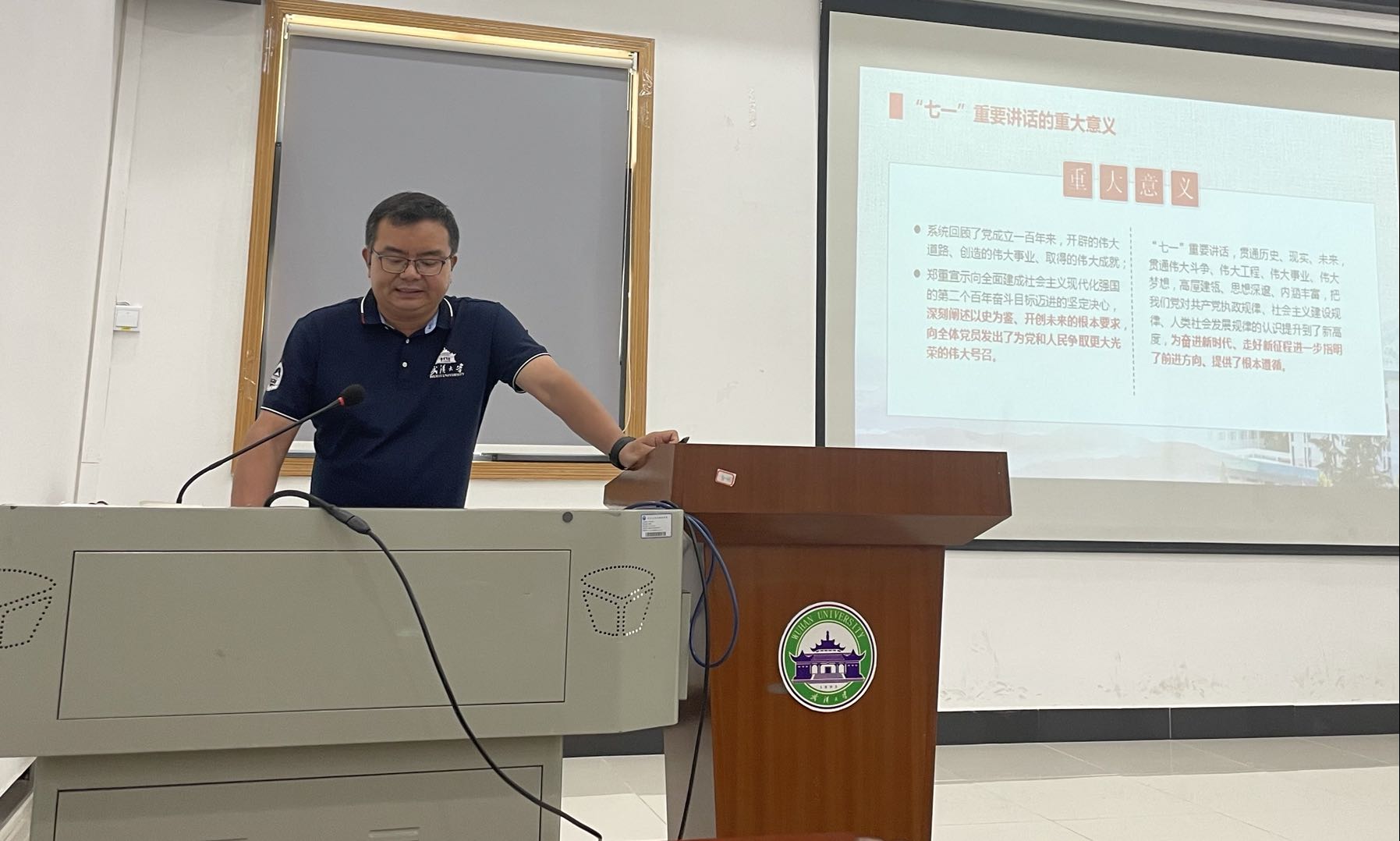 党委书记王建波通过PPT讲解,带领参会人员重温了习近平总书记在庆祝中国共产党成立100周年大会上的重要讲话。他认为,此次讲话系统地回顾了党成立一百年来的光辉历程;郑重地宣示了向全面建成社会主义现代化强国的第二个百年奋斗目标迈进的坚定决心,深刻阐述以史为鉴、开创未来的根本要求,向全体党员发出了为党和人民争取更大光荣的伟大号召。“七一”重要讲话,把我们党对共产党执政规律、社会主义建设规律、人类社会发展规律的认识提升到了新高度,为奋进新时代、走好新征程进一步指明了前进方向、提供了根本遵循。
