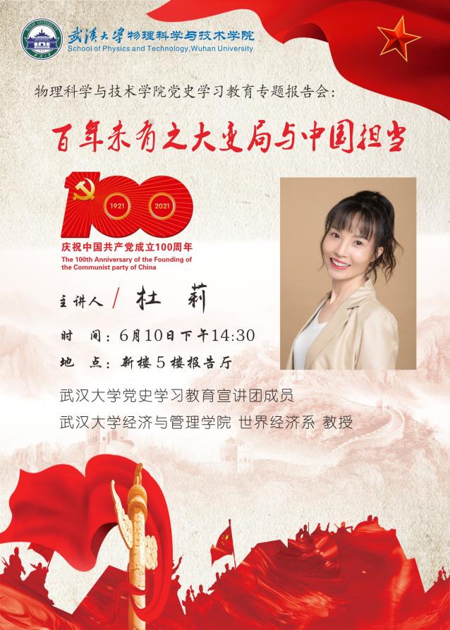 6月10日下午,学院召开党史学习教育专题报告会暨党委理论学习中心组(扩大)会议,特邀骰宝规则 党史学习教育宣讲团成员、首届全国高校青年教师教学竞赛一等奖获得者经济与管理学院杜莉教授,作《百年未有之大变局与中国担当》专题报告。院党委理论学习中心组成员、教职工党员、学生党员代表等参加学习,报告会由党委副书记张一飞主持。