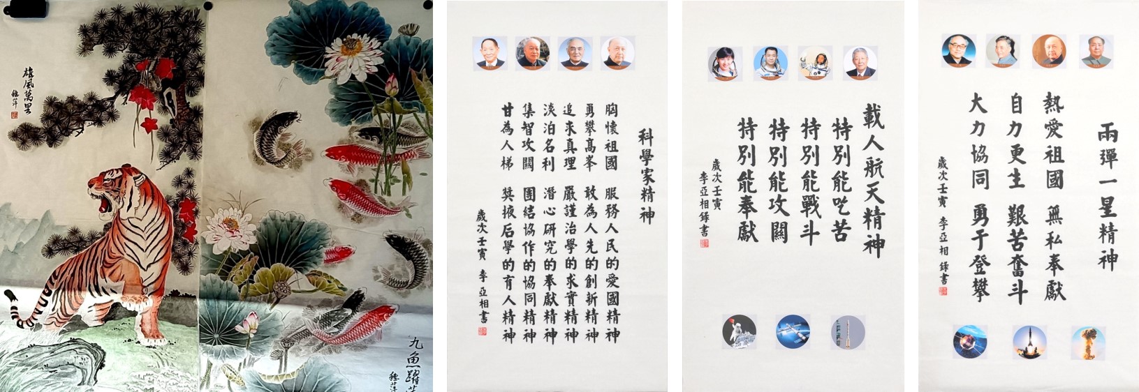 当年到边远荒漠地带参与两弹工程的杨宜城、沈自烈、方振慈、王仁琦四位校友,对《两弹一星精神》……三幅书画的感受尤为特别、自感当年能为国家所作的艰辛付出值得、欣慰!