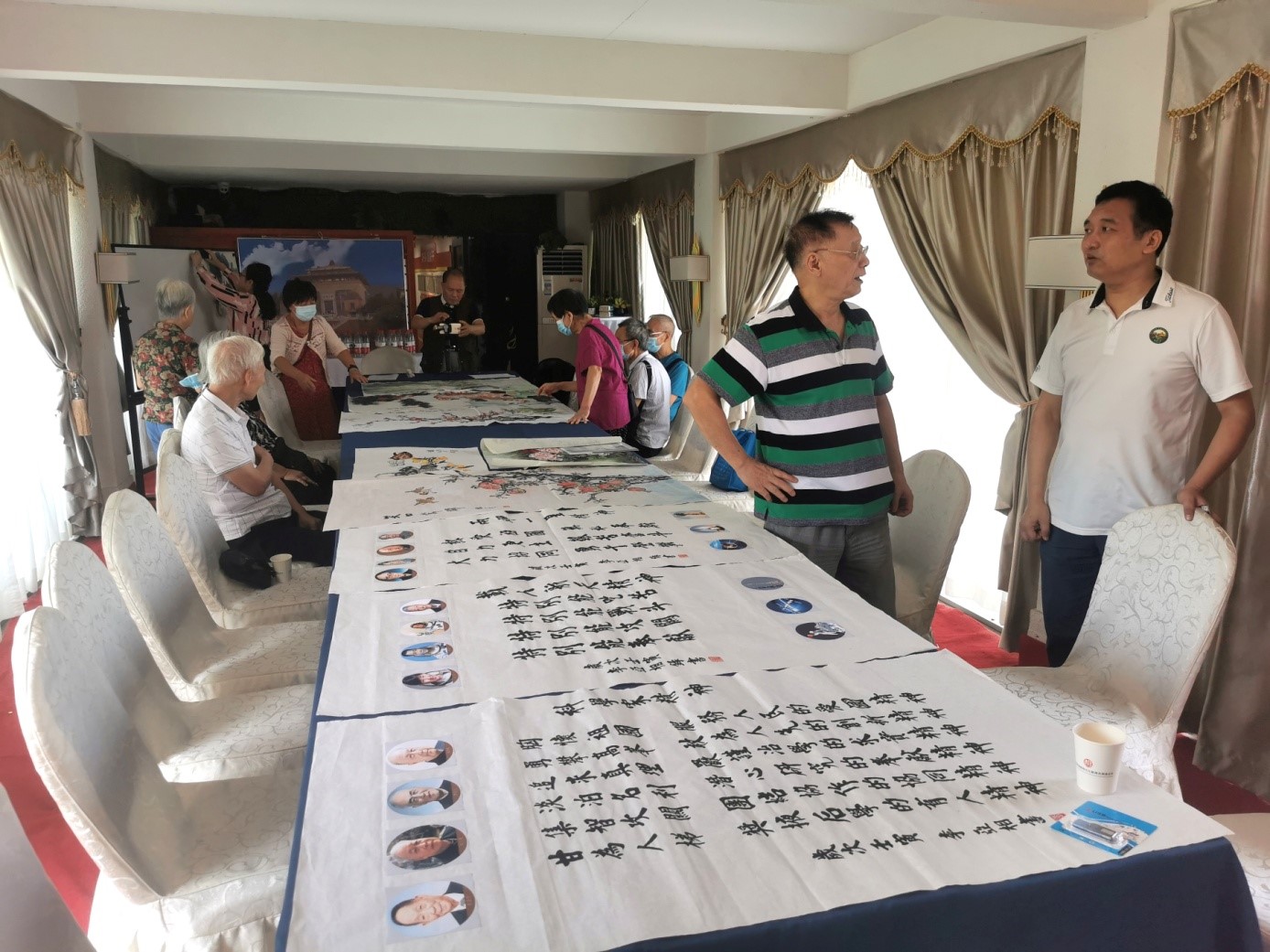 物理广东耄耋校友康乐汇》横幅耀入眼帘,看到摆在会场的行政大楼大幅摄像、墙上挂着“花好月圆 岁岁年年”庆中秋和激情的字画、桌面上摆满着各种绚丽的作品,先是有点骇然,转瞬心情变得特别喜悦、舒畅。老相识喜又聚首、稍稍话儿不停;不认识的喜得新朋友,似乎就是回到了自己的“珈”,感到特别喜庆和温馨。当53级88岁的邹炳松老学长由儿子专程从广州天麓湖养老院护送、同班同学王世进领入会场时,顿时赢得在场校友们的热烈掌声;他是首次参加武物校友聚会的,感到特别欢快和喜悦,兴奋地与学弟学妹们共同分享难得的好时景。
