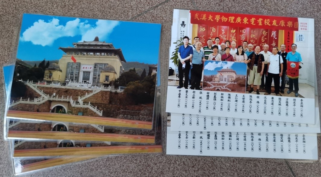 物理广东耄耋校友康乐汇》聚会活动。这道信息一发出,居深圳的62级申益春就构思写下了大幅“寿—何止于米 相期以茶”和“但愿人长久 千里共婵娟”庆中秋的作品供会场展示。62级邹幼新(山东东营)、周有贵(海南)、李亚相(广州)以纪念进校60周年并献给广东耄耋校友康乐汇为题,合同作诗《七律 武物情愫》“各地青衿汇珞咖 相扶砥砺似一家 潜心聆听名师诲 求索攀登智慧崖 四海星分难聚首 一朝逢拥泪飞花 春秋五秩如驹隙 耄耋康宁享晚霞”,李亚相还将诗词书写在大幅纸张上供会场展示;李亚相还特制了一幅1米×1.33米武大行政大楼的摄像安放在会场显著位置,以使会场有“回珈(家)”的感觉。李亚相把《珞珈赋》作者何五元的“永是珞珈一少年”名句书写成了大幅字轴供会场展示。62级钟穗萍专心作了《九鱼跃莲池》和《雄风万里》两幅大画作供会场展示。李亚相还把应“粤二·九”联谊会秘书长杨宜城请求书写的《两弹一星精神》《载人航天精神》《科学家精神》三幅大书画供会场展示。