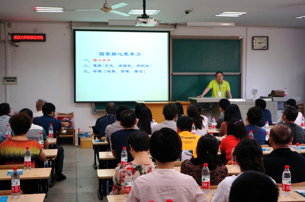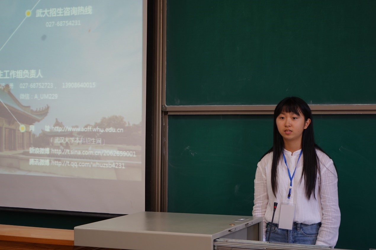 的办学历程谈起,介绍了学校学科体系、学科排名、国际交流、师资力量、校园环境等方面的基本情况。他还从教授亲自为本科生授课、业余科研训练、班级导师制度、教师队伍建设、通识大类教育、转专业、第三学期课程、学生学科竞赛、毕业生流向等多个方面,全面介绍武大本科生教育理念与培养质量。对于家长比较关心的招生类别、自主招生、高考录取等,黄启俊教授做了比较详细的政策解读,并热情欢迎各位家长和指导老师组织学生来武大游学参观。