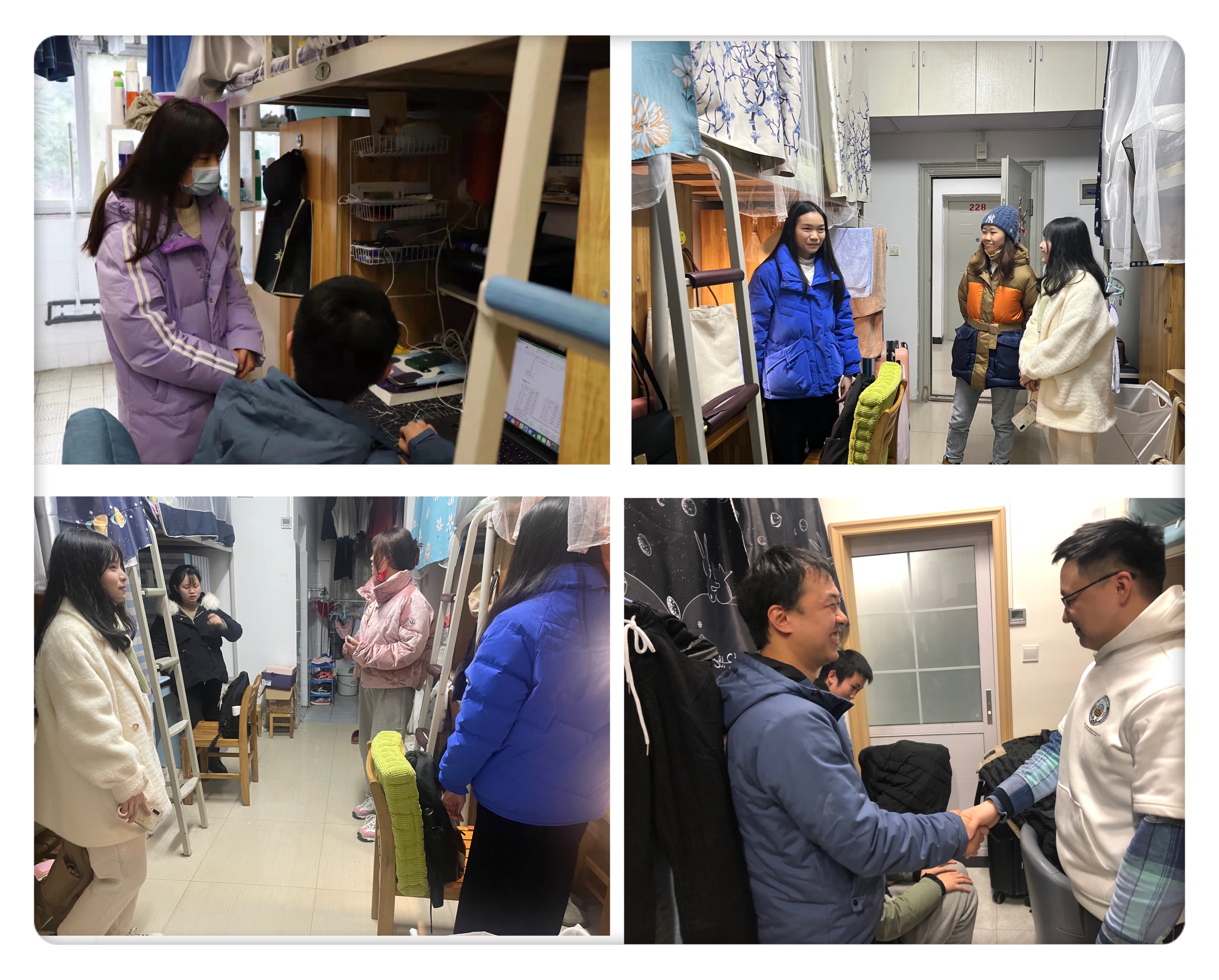 为了解同学们在疫情防控期间返校后的生活情况,2月13日,本科生辅导员龙云翔、研究生辅导员刘文娣以及几位兼职辅导员分别走访了学生宿舍,看望刚刚返校的同学们,为大家送上学院的关心与祝福。