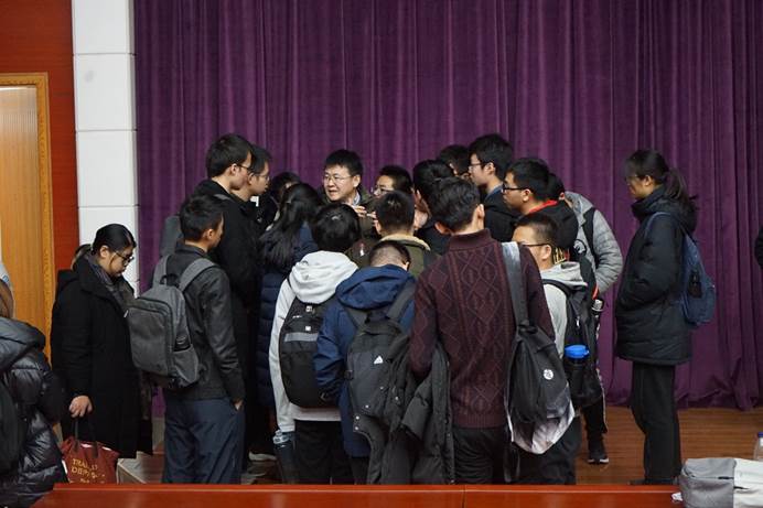互动交流环节中,有同学对刘继峰教授曾提出的“寻找地外行星与生命就是探测液态水”表示疑惑,不少听讲学生纷纷点头,好奇不已,刘继峰教授以自身生活规划为例,提出科研应该先做可以做的,比如探寻需要液态水的生命体,同时思考如何达到暂时无法实现的目标,比如探寻不需要液态水的生命体。同学们还就刘教授最新发表在Nature上有关“黑洞”的研究成果、研究团队、研究过程、望远镜类型提出疑问,刘继峰教授一一解答,会后同学们围绕在刘教授身边积极提问,深入交流。