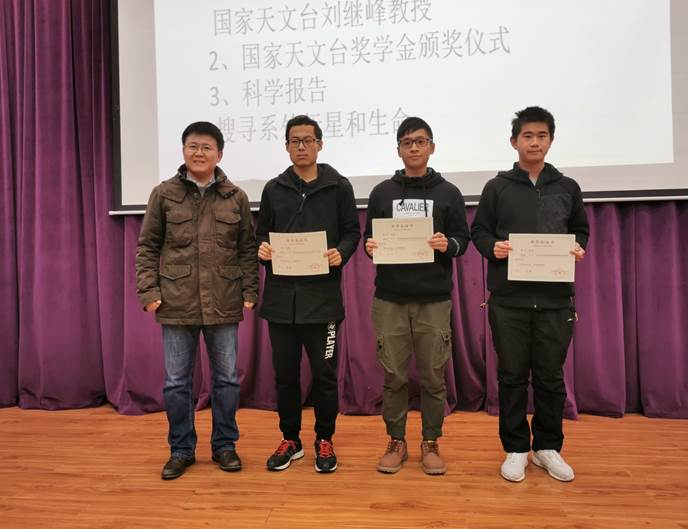 本科生唐宇明、吴岳、詹世宏颁发“国家天文台奖学金”,鼓励同学们在天文学领域积极进取,努力拼搏!
