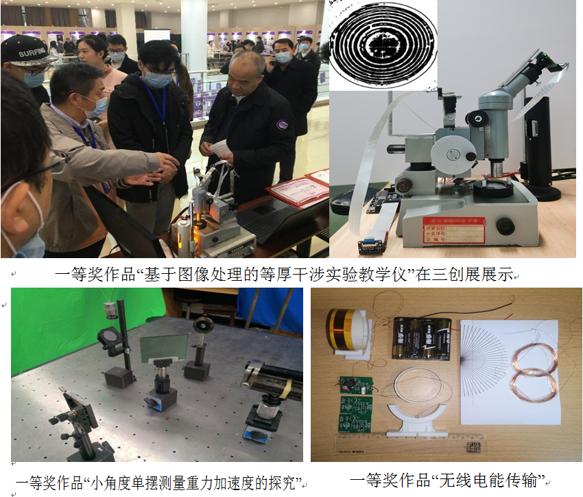 “三创”成果展示会上展示,其关键技术已提交专利申请;王豪指导的“无线电能传输”,参赛学生鲁若天、孙家霖、龙禹川、朱若溪、杨钦宇,作品以自制的小型化、低成本无线电能传输实验器材为基础,设计了基础性和专业性相融合的实验内容。获得二等奖的作品分别是林伟华指导的“弹簧振子的简谐振动(虚拟)”,参赛学生潘楚铖、张永煊;王晓峰、王豪指导的“密立根油滴虚拟仿真实验”,参赛学生陈玥君、谈冰玚、黄志园、郑珺文、张路。