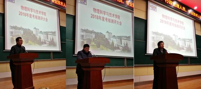 辅导员工作考核民主测评、团干考核测评与本考核同场进行,区分对象、一次述职、分表打分。考核大会分为三个阶段,第一阶段是专职辅导员暨团干考核,以辅导员岗位职责为基本依据,全面评价辅导员的履职表现和工作业绩,切实加强辅导员队伍建设。学院四位专职辅导员依次从思想理论教育和价值引领、党团和班级建设、学风建设和科技实践、学生日常事务管理、心理健康教育、网络思想政治教育、校园危机事件应对、职业规划与就业创业指导、理论和实践研究等方面进行了工作汇报。随后,学院办公室的其他9位行政管理人员分别进行了大会第二阶段的述职报告,结合自身的岗位职责,对2018年度的整体工作进行了全面回顾与总结。大会第三阶段,学院实验系列的13位专业技术人员也进行了工作汇报,分别汇报了物理实验教学的总体情况和大型仪器设备的管理使用情况等。
