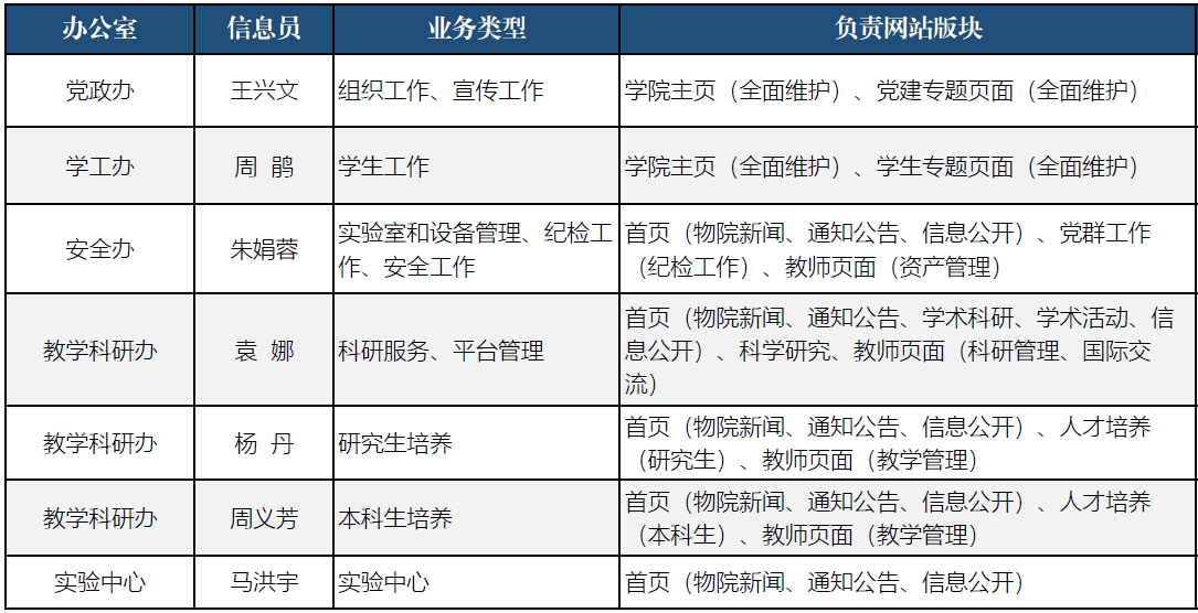 学院专职组织员、宣传员王兴文首先介绍了信息员的任务分工和工作内容。信息员一方面要承担各自负责工作相关宣传材料的组织、撰写、修改、呈报和上传,另一方面要加强与学校相关职能部门的对接和联系,及时将学院重点亮点工作向职能部门推荐,并学习借鉴先进标准和标杆院系做法,促进业务工作不断进步。