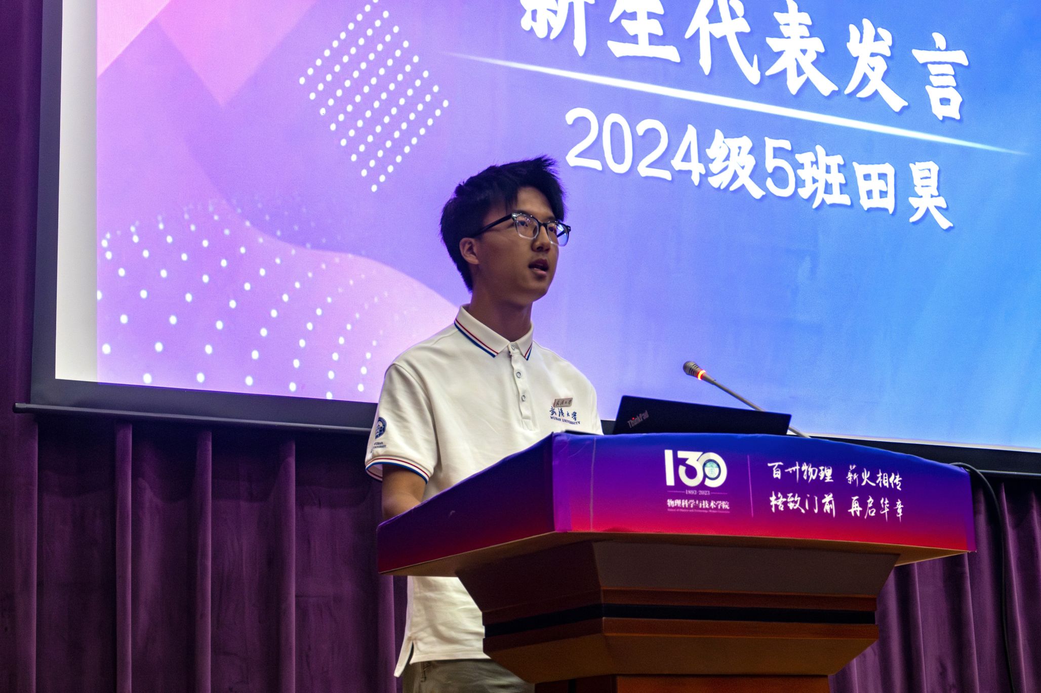 2024级5班田昊作为新生代表发言。他分享了自己与武大和物院结缘的故事,回忆了报到注册、军训、入学教育的点滴,表达了在珞珈山下增长才干、勇攀高峰的坚定信心,希望和新同学们一道,努力成为勤学笃行的物院人,在物院131周年之际传承物院精神、接续砥砺奋斗。同时也呼吁同学们在探索基础学科的过程中不忘追问本心、坚守初心、笃学砥砺,以赤子之心面对世界,不驰于空想,不骛于虚声,用知识充实自己,用实践磨炼自己,让大学生涯充满温度与情怀。