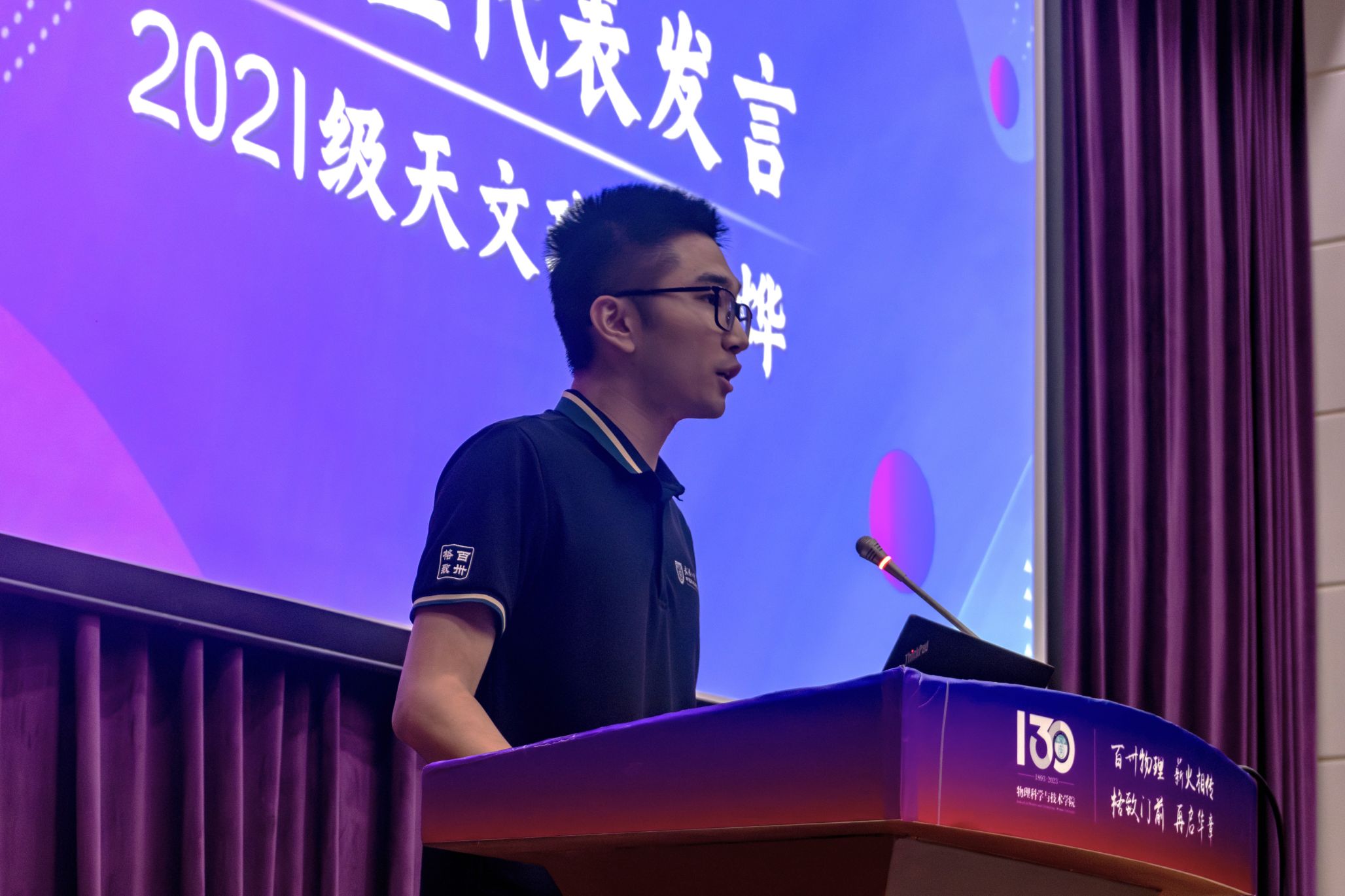 2021级天文班陈俊烨作为在校生代表发言。他回望大学三年,向新生们真诚分享自己在课程学习、学术科研和社会实践三方面的经历与感悟。一是要培养自律和自学的能力,同时主动寻求他律、利用信息化资源,选择志同道合的伙伴共同进步;二是要把握学院“本科生能力提升计划”机会,积极接触科研课题组,发掘探索个人兴趣,为未来参与科研训练选好方向,在科研的过程中要敢于试错并持之以恒的努力;三是积极参与第二课堂实践,在社会实践、志愿服务、人际交往中拓展认知、锻炼能力、实现价值,从而隐形地反哺于学习。他衷心祝愿每一位2024级新生都能够在物院收获知识,收获成长。