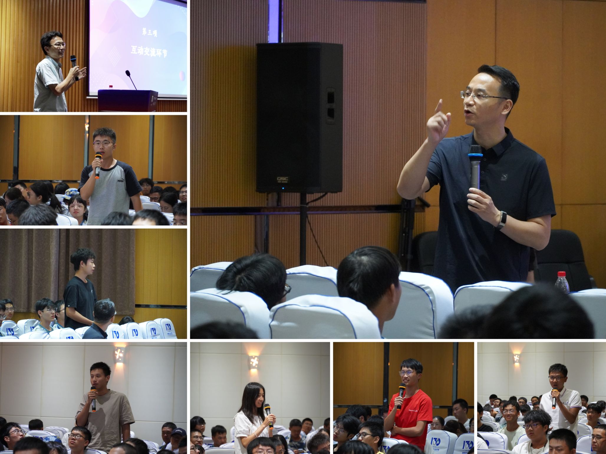在互动交流环节,新生们积极提问,与嘉宾们进行了深入的对谈。肖湘衡书记、王胜教授、刘沁如学姐耐心解答了新生们关于大学适应、学业、科研、职业规划等方面的疑问,并提供了实用的建议和指导。