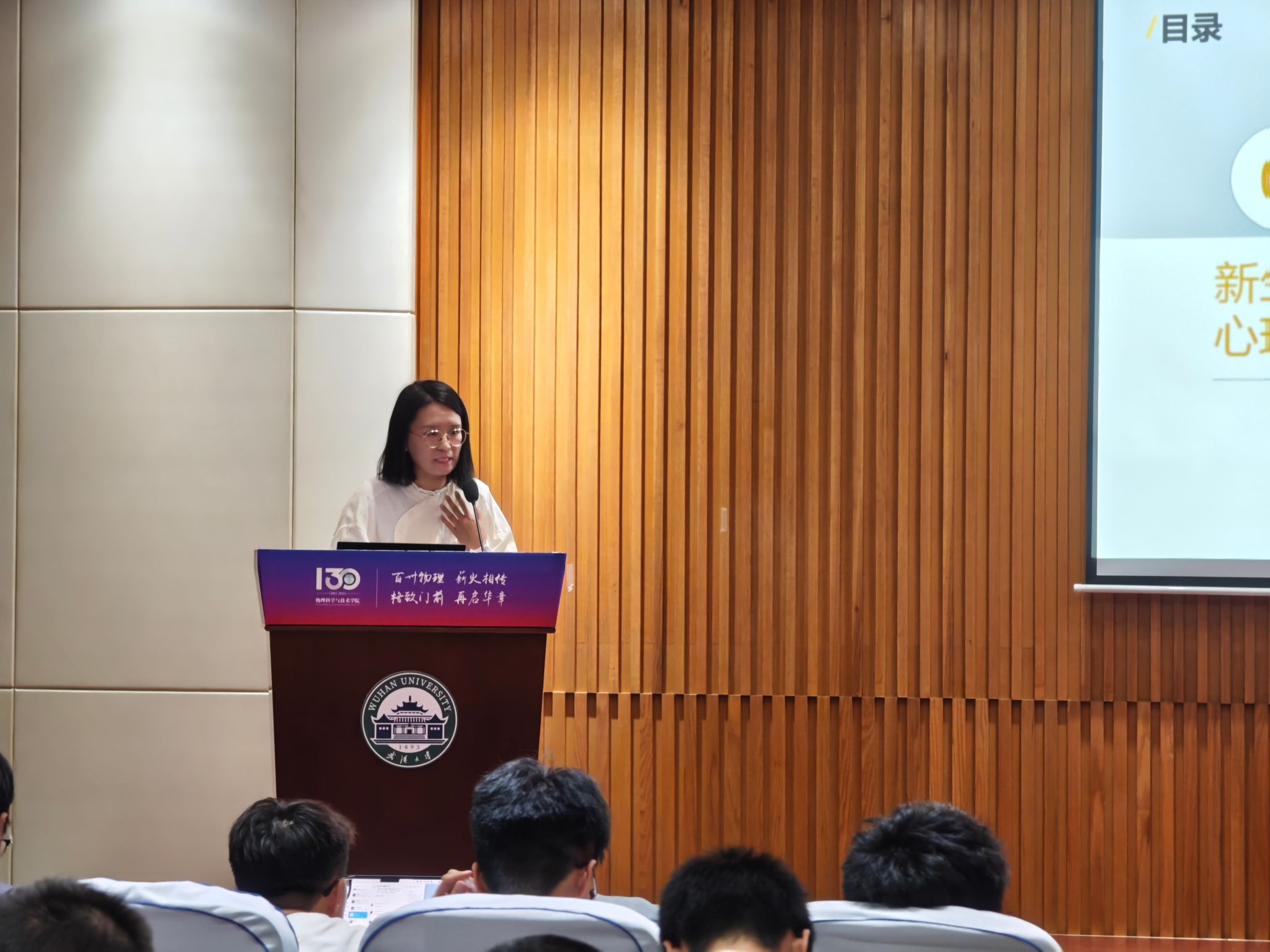 “在中学阶段,学生应该伏案学习;在大学里,他该站起来,四面瞭望”。聂玉秀老师以英国哲学家怀德海的教育名言引入,围绕新生常见心理困扰、心理咨询简介以及学校心理资源这三个方面详细展开。