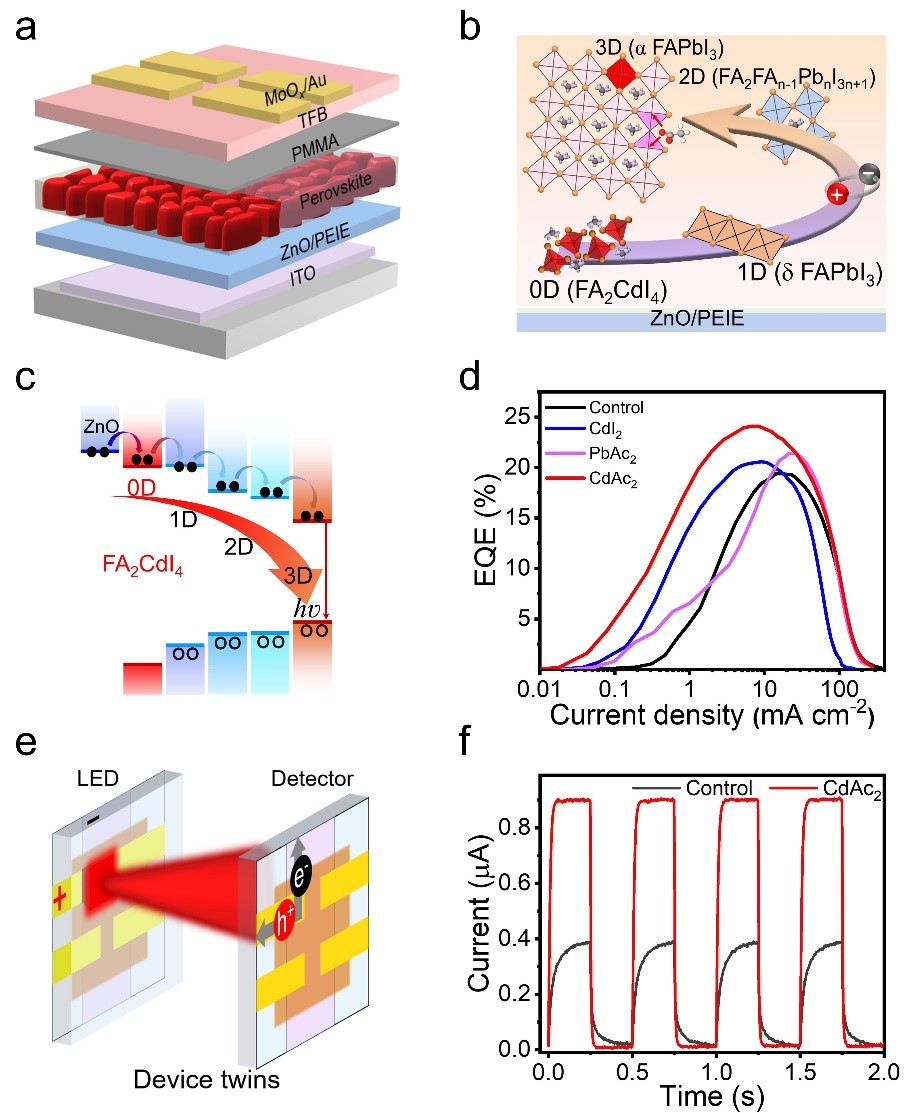 a 器件结构;b 醋酸镉协同钝化钙钛矿缺陷/过量甲脒生成包含零维、一维、二维和三维体系的梯度维度的钙钛矿及其类似物; c 梯度维度钙钛矿及其类似物的加速能量传输示意图; d 参比器件和包含不同添加剂的器件的发光性能曲线;e 孪生器件的发光与探测集成化示意图; f 器件实现自驱动探测的响应曲线。