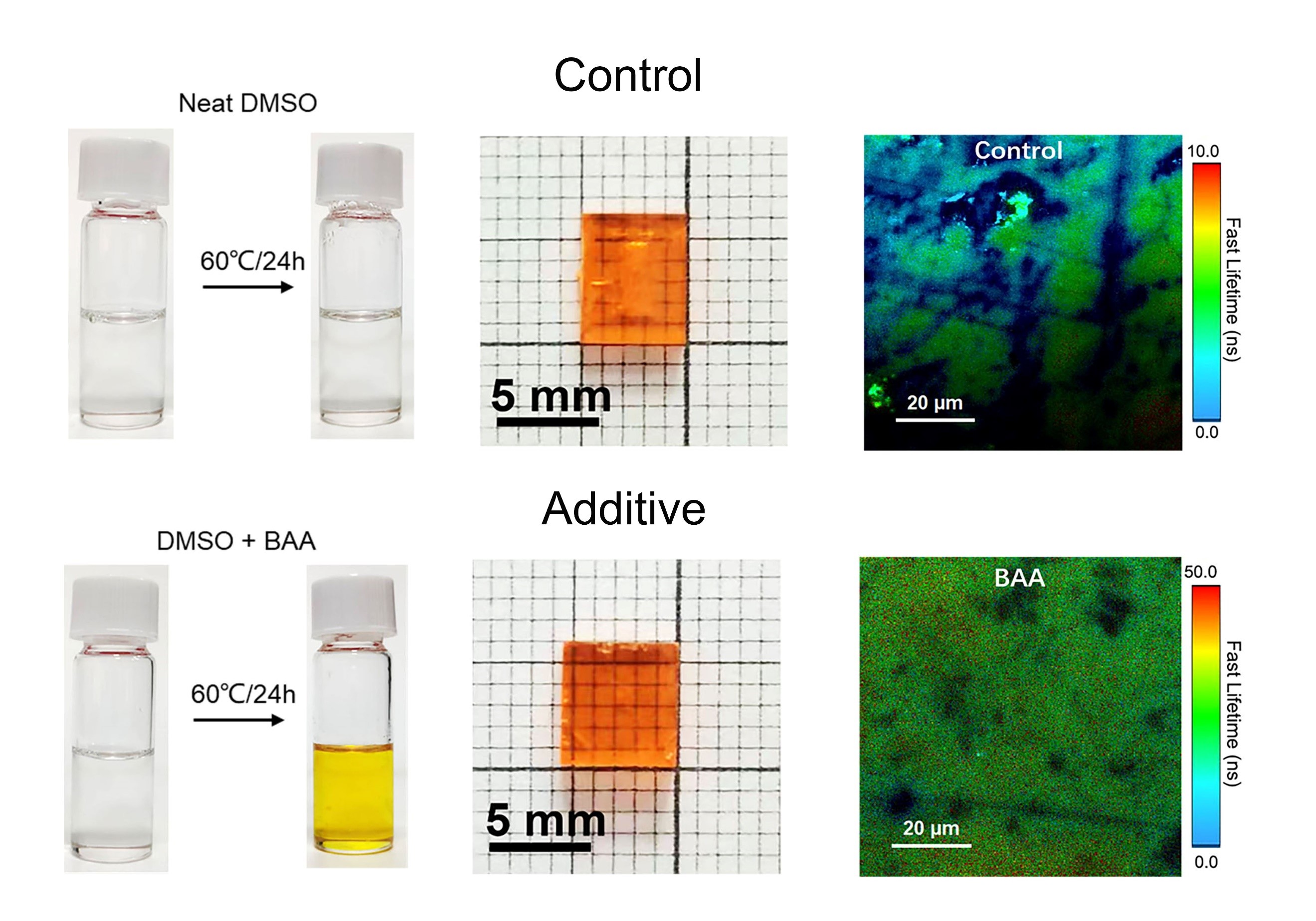 该工作创新性的提出了一种与单晶生长溶剂发生化学反应的添加剂进而制备高质量单晶的方法。该添加剂可以提高溴化铯在DMSO中的溶解度,形成平衡的化学计量前驱体溶液,防止杂相形成。此外,该添加剂与DMSO反应生成的产物,可以与PbBr2和DMSO生成稳定的配合物,使生长的单晶具有更好的结晶度、均匀性和更长的载流子寿命。同时,使用添加剂增强的单晶的X射线探测器具有3.0×104 μC Gyair-1 cm-2的超高灵敏度,比未使用添加剂的器件灵敏度高出两个数量级以上。本文为制备高质量的钙钛矿单晶提供了一种新的方法和思路。该研究得到了国家自然科学基金和湖北珞珈实验室专项基金的支持。