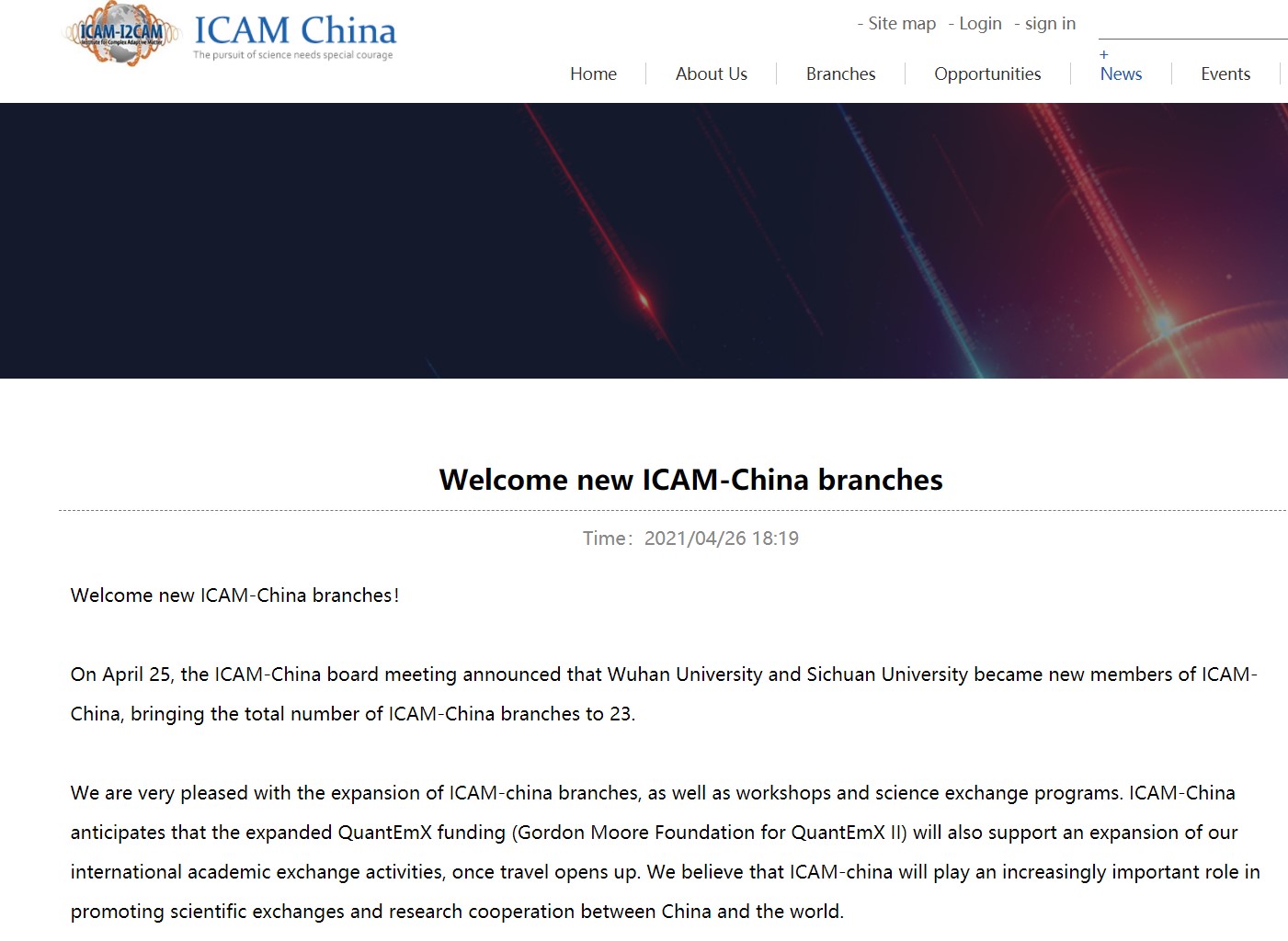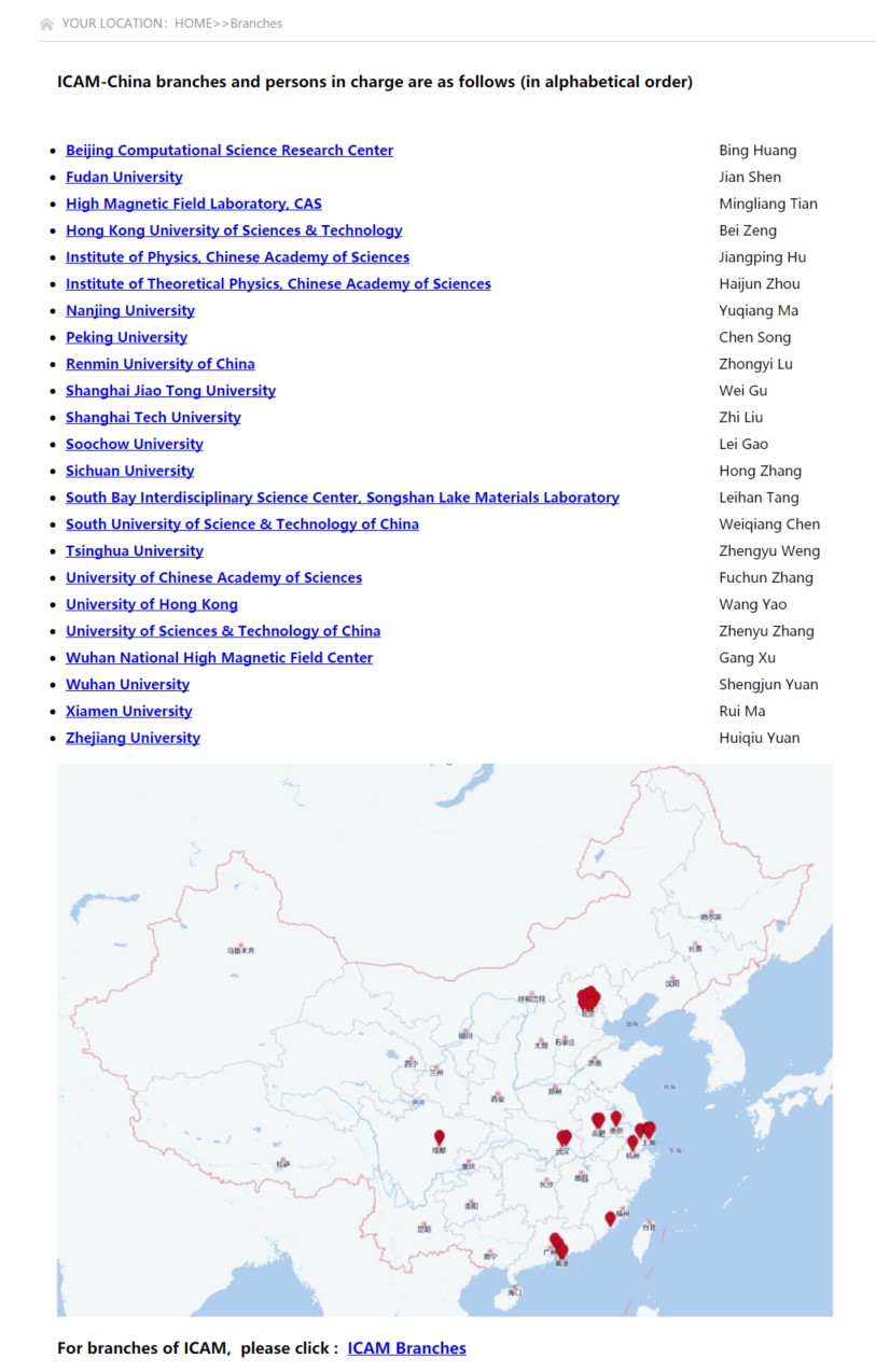 Institute for Complex Adaptive Matter(ICAM)成立于 1999年,它以一种开放的、动态的合作伙伴关系将来自不同地区的研究机构和物理学家聚集在一起,开展合作研究和培训交流。迄今为止,ICAM在世界范围拥有72个分支机构。ICAM-China成立于2012年1月,至2020年,ICAM-China已经发展成为一个由21家研究机构组成的跨学科学术合作及交流的联合组织,涵盖从理论到实验,从物理、化学、生物到材料科学的交叉领域。ICAM-China旨在为物质、材料以及生命科学之间的跨学科研究提供合作和交流的平台,并深入持续地支持和推动国际学术交流和教育活动在中国的开展。