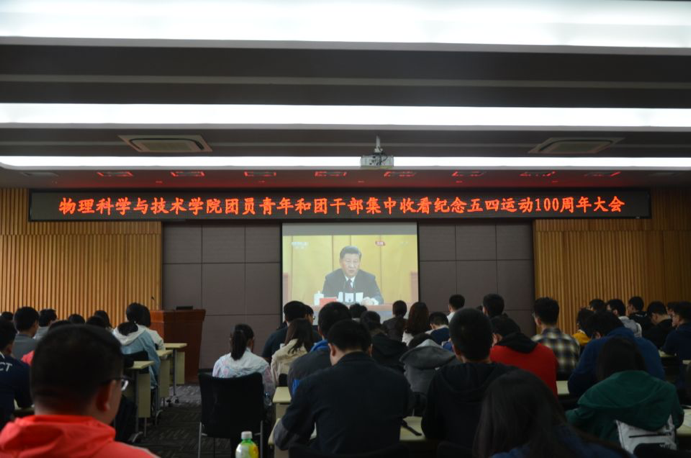 430日上午1030分,纪念五四运动100周年大会在人民大会堂隆重举行。物理科学技术学院团委组织团员青年和团干部,在新楼多功能厅集中收看大会直播,认真学习习近平总书记发表的重要讲话。
