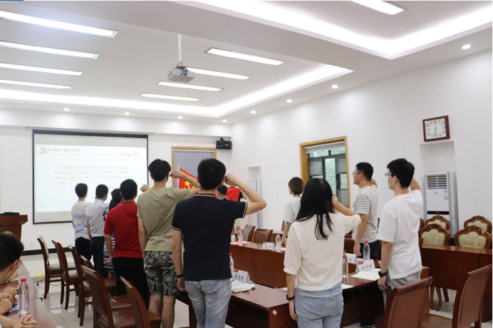 本次的主题党日活动分为五个环节。主持人孙晟珂首先介绍了党支部成员,汇报了党费的收缴情况。之后全体党员起立,以响亮而饱满的声音重温了入党誓词。
