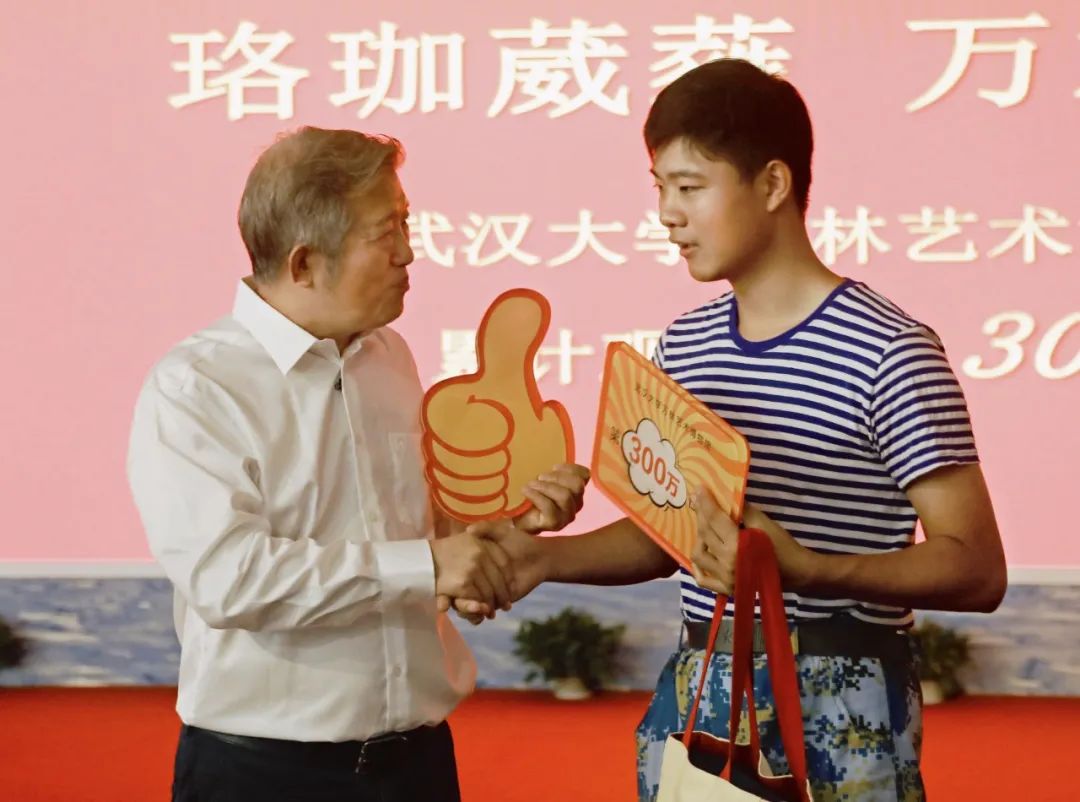 杰出校友、泰康保险集团股份有限公司董事长兼首席执行官陈东升先生为第三百万位观众颁发纪念品。