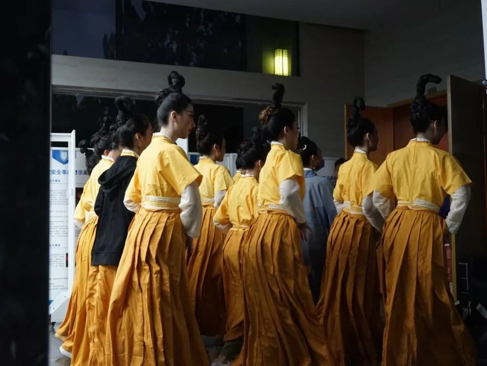 无数个日夜的辛勤排练,在舞台灯光聚焦的那一刻,化作了璀璨夺目的艺术呈现。桂花飘落,香气袭人,梅操舞台好似被秋色与花香温柔包裹,诚邀每一位过客驻足欣赏这秋日里的独特风景。而舞台上,18位舞者化身为宋代少女,她们或赏花、或嬉戏、或精心插花,以曼妙的舞姿勾勒出一幅幅古风画卷,引领观众步入一场浪漫唯美的古风花开梦境。