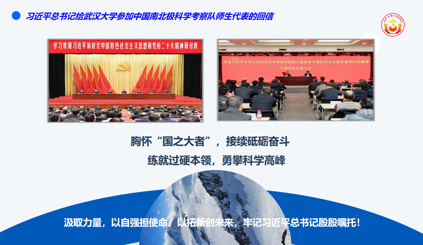 参加中国南北极科学考察队师生代表的回信精神为主线,生动展现了武大师生在南极科考中的英勇事迹与卓越贡献。刘进思讲师详细介绍了南极科考的极端环境与重要意义,回顾了骰宝规则
