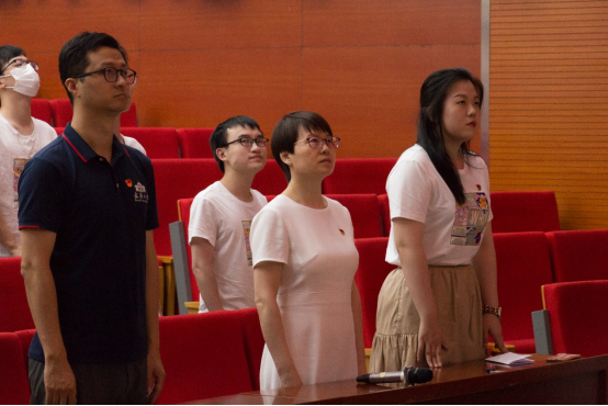按例,第一项为奏唱中华人民共和国国歌。往日看似平常的国歌在这不一样的节点被赋予了非同寻常的意义,激励着毕业生党员们在未来的学习与工作中不忘爱国主义精神,成为一名爱国爱党爱人民的共产党人。