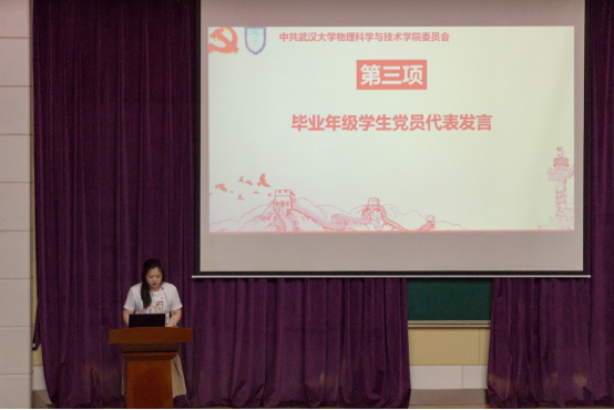 随后,毕业生党员代表发言。弘毅学堂2022届本科毕业生李家欣同学回顾了自己本科阶段在学生工作中的成长历程。一群志同道合的成员“筚路蓝缕”,从制度建设到策划活动,工作或繁琐,或不为人知。但正是在这些工作中,她的理想信念越发坚定,立志为共产主义事业奋斗终身。她号召在场的同学一同坚持初心、不断努力,相会于中华民族伟大复兴之时。